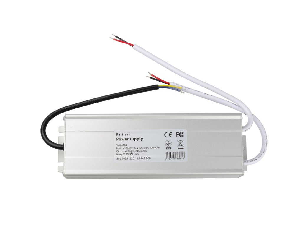 Input voltage: 100-260V, 0,6A, 50\60GhzOutput voltage 24V/6.25A, power 150W maxDimensions - 222х69х43mm, 900g