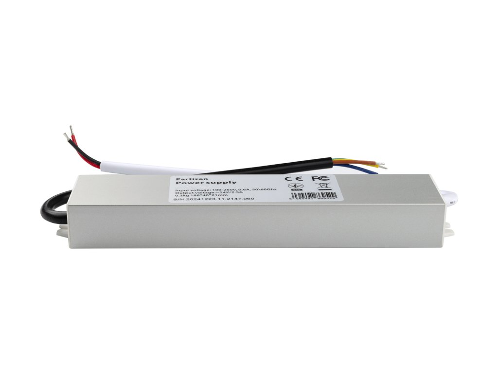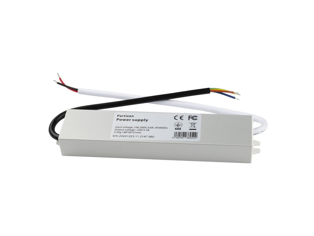 Input voltage: 100-260V, 0,6A, 50\60GhzOutput voltage 24V/2.5A, power 60W maxDimensions - 188х40х21mm, 300g