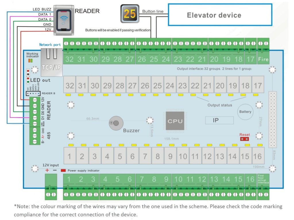 – TCP/IP elevator access controller – Control output: 32 – Max number of users 120000 – Max number of events 200000 – Fire alarm out – Wiegand input interface – Built-in web interface – Ethernet interface – Free professional Software 3 years warranty