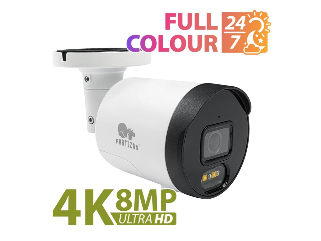 The new model is equipped 1/2.7″ CMOS matrix with a resolution of 8.0 megapixels (4K). This outdoor camera generates an improved Ultra HD image format, which allows recognizing small objects and banknotes. The device has a wide viewing angle. This device is equiped with a revolutionary hybrid IR White LED and able to provide a stunning and clear 24/7 color image due to its powerful white LEDs, even in the pitch dark. It can also work in classic IR black and white night mode or in new hybrid IR White LED Smart Detection mode. At night Smart Detection mode will allow your camera to use IR and white LEDs light as a perfect combo to avoid disturbing your neighbors and at the same time detect any possible intrusion. You will have a black and white image if nothing going on and then the camera will immediately switch on white LEDs and provide you color image at night in case of detection of the intruder! The maximum viewing distance in full darkness is 20 meters. The model supports Active Deterrence technology. This feature set allows deterring potential wrongdoers, thus preventing possible crimes. If the CCTV camera detects a line crossing, perimeter Intrusion, or movement within its surveillance area, it activates a red and blue visual alarm and/or a siren sound. Upon activating Active Deterrence, the user can receive push notifications in the Partizan mobile application, and thanks to the built-in speaker, the user can personally address the person who has entered the CCTV camera's coverage area. The intelligent algorithms of Active Deterrence minimize false triggers. The POE support ensures the possibility of powering via data cable that greatly simplifies the process of equipment installing. The housing of the device, as well as housing of all surveillance cameras IPO. The device has a high protection class against dust and moisture and its operation temperature range is -40 to 60 °C, so it can be mounted both inside and outside.Main Features