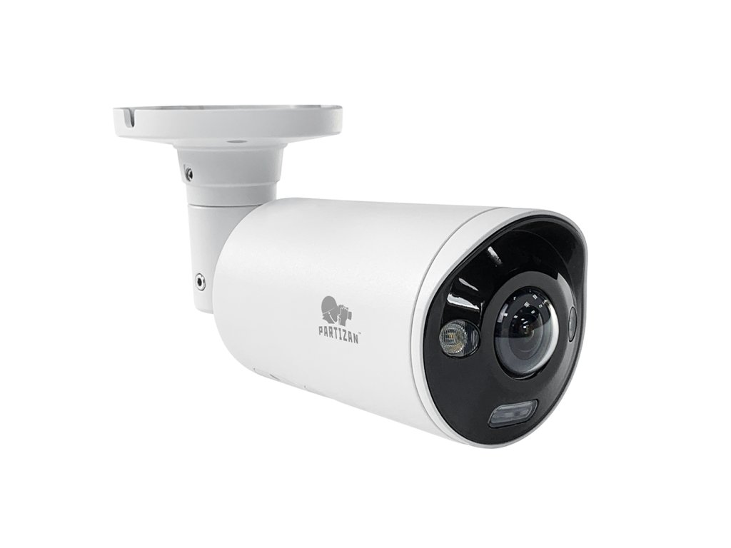 The new model is equipped 1/2.8" CMOS matrix with a resolution of 8.0 megapixels (4K). This outdoor camera generates an improved Ultra HD image format, which allows recognizing small objects and banknotes. The device has a Angle of View 180° This device is equiped with a revolutionary hybrid IR White LED and able to provide a stunning and clear 24/7 color image due to its powerful white LEDs, even in the pitch dark. It can also work in classic IR black and white night mode or in new hybrid IR White LED Smart Detection mode. At night Smart Detection mode will allow your camera to use IR and white LEDs light as a perfect combo to avoid disturbing your neighbors and at the same time detect any possible intrusion. You will have a black and white image if nothing going on and then the camera will immediately switch on white LEDs and provide you color image at night in case of detection of the intruder! The maximum viewing distance in full darkness is 15 meters. The model supports Active Deterrence technology. This feature set allows deterring potential wrongdoers, thus preventing possible crimes. If the CCTV camera detects a line crossing, perimeter Intrusion, or movement within its surveillance area, it activates a red and blue visual alarm and/or a siren sound. Upon activating Active Deterrence, the user can receive push notifications in the Partizan mobile application, and thanks to the built-in speaker, the user can personally address the person who has entered the CCTV camera's coverage area. The intelligent algorithms of Active Deterrence minimize false triggers. The POE support ensures the possibility of powering via data cable that greatly simplifies the process of equipment installing. The housing of the device, as well as housing of all surveillance cameras IPO. The device has a high protection class against dust and moisture and its operation temperature range is -40 to 60 °C, so it can be mounted both inside and outside.